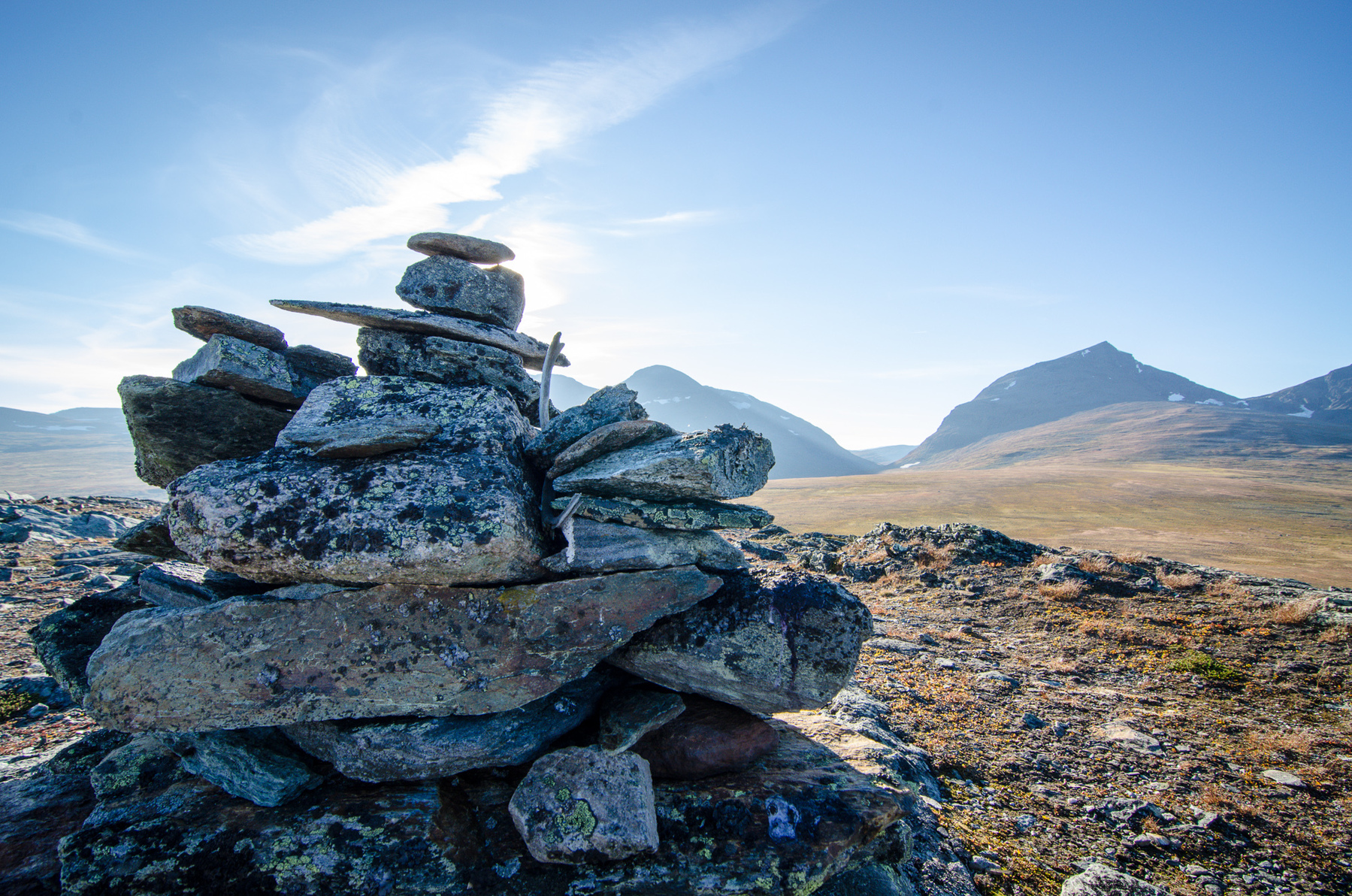 Här har vi slagit oss ner för dagens sista paus, på toppen av Vuekienaesie, innan sista utförsbacken mot #syterstugan. I bakgrunden ser man både södra Sytertoppen och norra Sytertoppen, ingången till #Syterskalet däremellan. #kungsleden